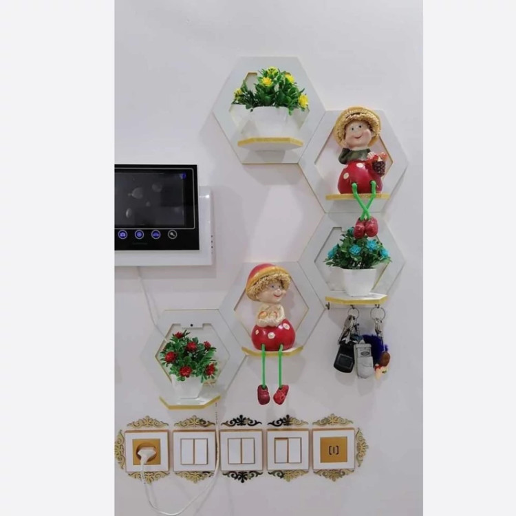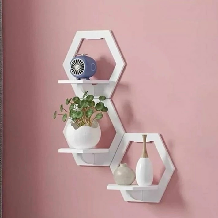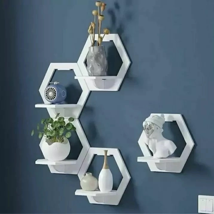 شلف دیواری شش ضلعی با ظاهری ساده نمایی هندسی بسیار زیبایی دارد ترکیب 5 عددی این شلف ها در زوایای مختلف در کنار هم جلوه های متفاوتی به منزل شما می دهد